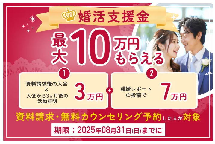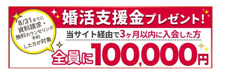 まさに今行われているキャンペーンですが、『結婚相談所比較ネット』では、このような婚活支援金がプレゼントされることもあります。