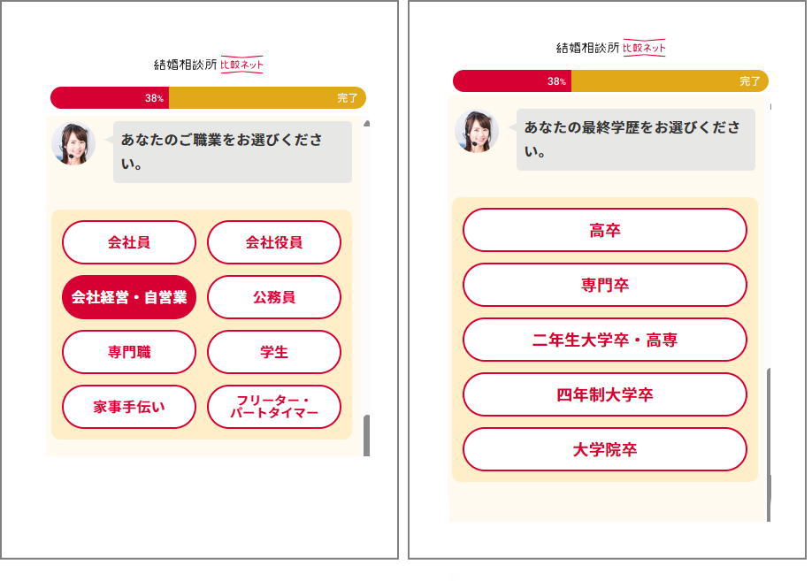 お住まいの地域などから、一人ひとりにぴったりな結婚相談所3~6社を厳選して紹介してくれるシステムです。