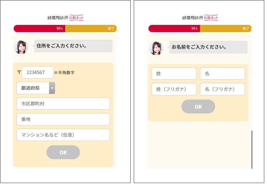 スマートフォンで『結婚相談所比較ネット』にアクセスし、「50歳の方」のボタンから入り、名前・生年月日・職業・学歴・住所・電話番号・メールアドレスを入力するだけの簡単申し込み。