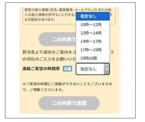 「担当者より適切なご案内をさしあげるため…」と連絡希望の時間帯入力欄があり、19時以降にされたのだとか。